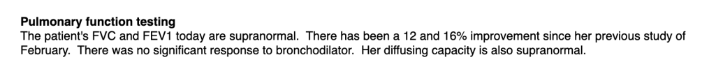It was a lovely google to find the definition. How nice to get a result that is better than expected and that my pulmonary situation is possibly improving or at minimum not getting worse. MAYBE last time when I was strugglebussing the test that might have made it worse, but this was also better than the test prior to that one too. So I will take this W as the kids would say.